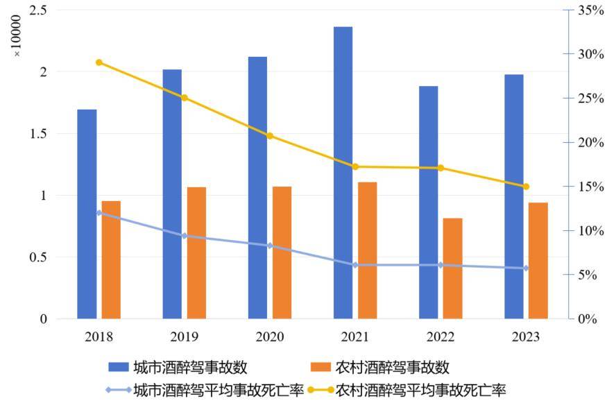 农村地区人情往来、聚饮文化浓厚,公共交通、代驾服务覆盖不足,加之巡查力度有限,助长了酒后驾车的侥幸心理。农村公路酒驾事故死亡率约20%,是城市的3倍,如图 4。在涉酒亡人事故中,农村驾驶人血液酒精含量高于城市,酒后超速倾向也更明显,车速平均提升3.5-8.8 km/h。