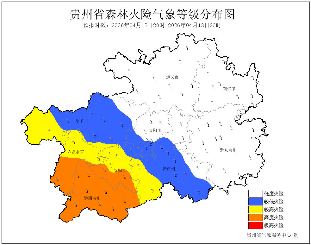 今天夜间到明天白天,省的西南部地区多云,午后伴有4-6级偏南阵风,森林火险气象等级高,其余地区阴天间多云有阵雨或雷雨,遵义市、贵阳市北部、铜仁市、黔南州北部局地有中到大雨,个别地区伴有短时强降水、冰雹、雷暴大风等强对流天气;