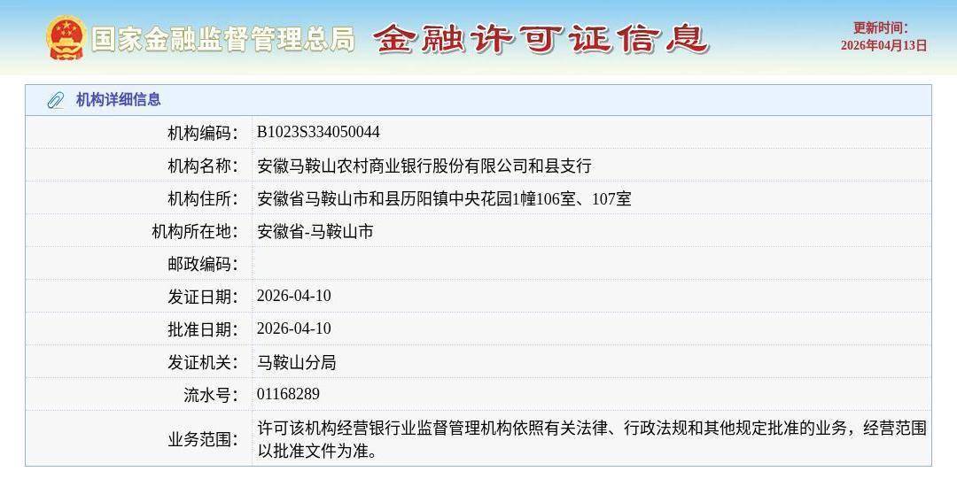 4月13日,根据国家金融监管总局许可证信息查询平台,安徽马鞍山农村商业银行股份有限公司和县支行颁发金融许可证,发证日期2026年4月10日。