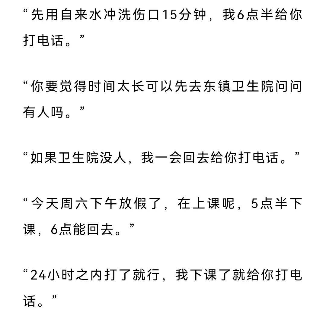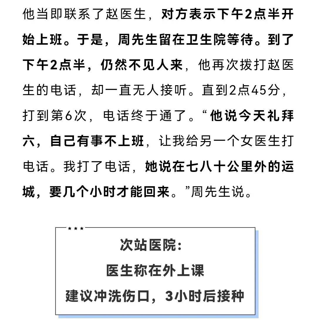 对于周先生11日下午的经历,她回复:“昨天下午(医生)是出去了,他3点钟打的电话,6点钟医生过来给他打的。我们周六、周天放一天半假,医生不在,但是打电话就会来。如果医生在家,马上就能来;如果医生在外面,就会让患者先用水处理一下,然后医生回来了再给患者打电话。不是故意不给他打,也打上了。”