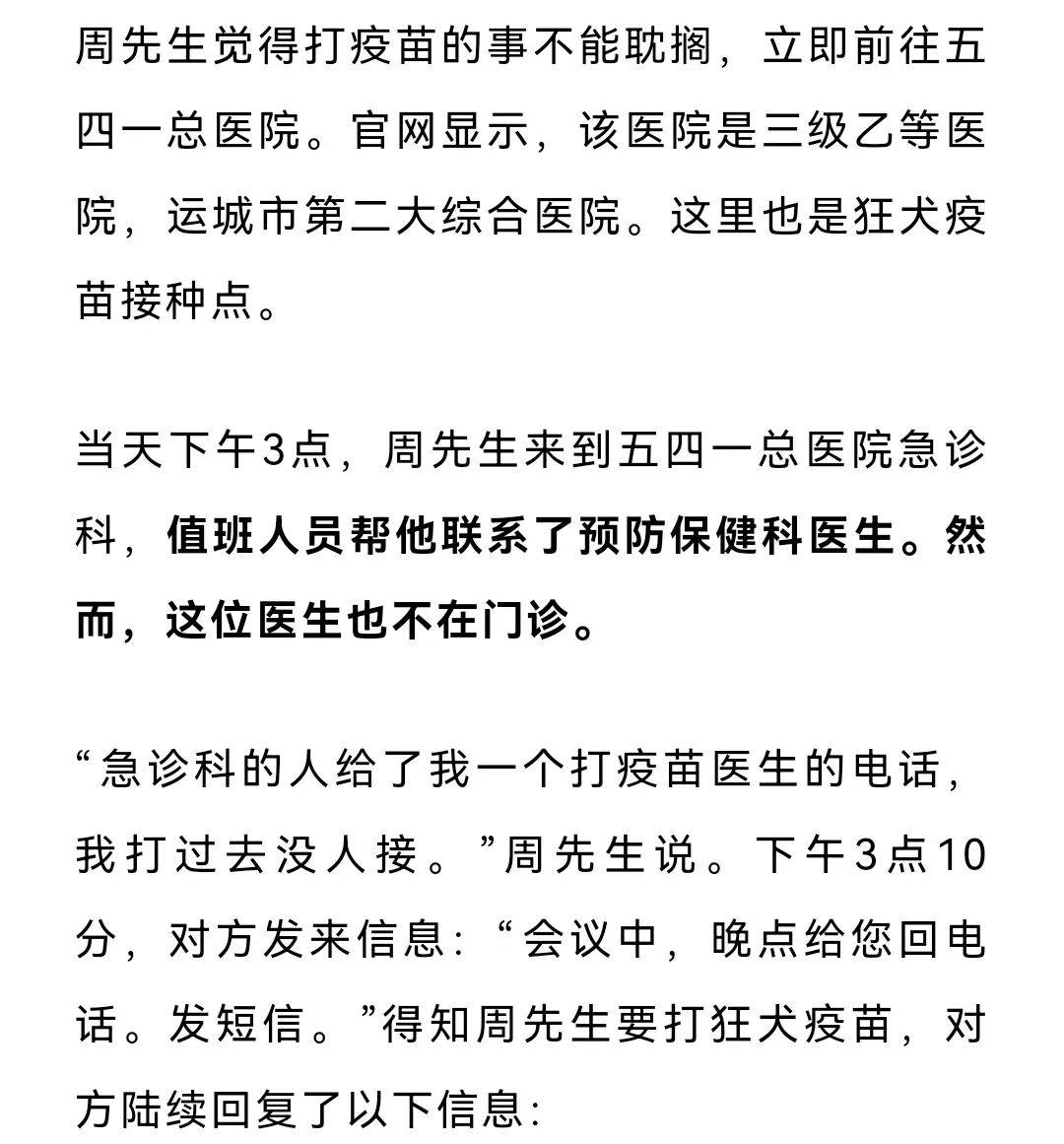 12日,记者多次拨打五四一总医院涉事医生的电话,一直无人接听。不过,记者拨通了该院预防保健科的电话。一名女性医护人员告诉记者,该院周末两天均能接种狂犬疫苗,如果医生不在,可以打电话联系。