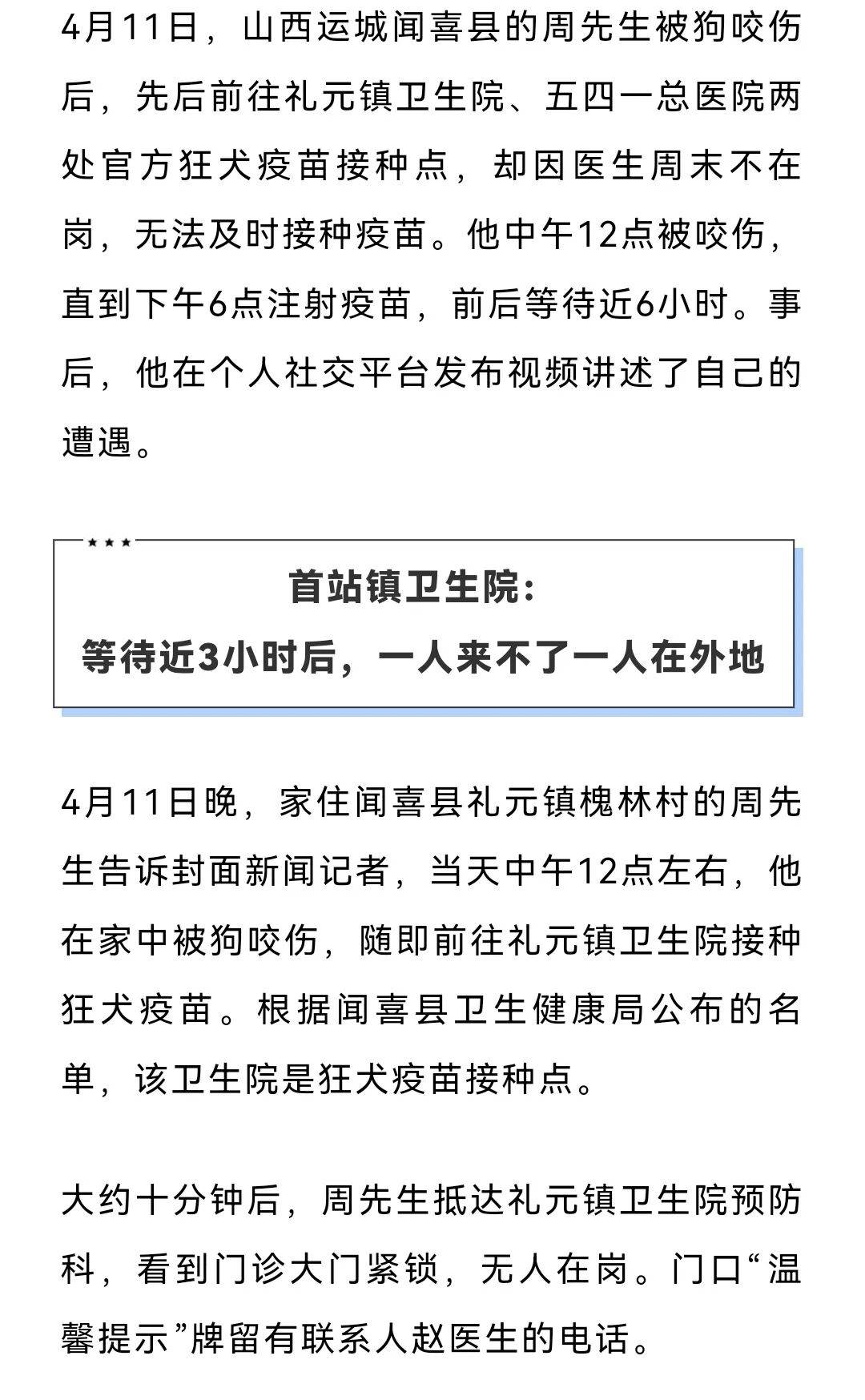 狂犬疫苗接种点周末是否应该有人在岗?三级医院的犬伤门诊是否需要24小时应诊?12日,记者拨打了闻喜县卫生健康局电话了解情况,但是无人接听。记者将持续追踪此事,请关注后续报道。