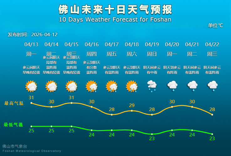 未来10天,佛山或持续闷热潮湿,雨水频频偷袭,市民外出最好随身携带雨具,注意防暑和防雨。其中,4月13日至15日受西南气流等影响,佛山云量较多,局部有雷阵雨,最高气温31℃;展望16日起雨水每日打卡,最高气温略有波动,后期最高气温有望降至“2”字头。