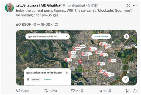 在特朗普就油价发表评论几小时后,卡利巴夫在社交媒体上发了一张华盛顿地区的汽油价格地图,并写道:“好好享受现在的油价吧。有了所谓的‘封锁’,你们很快就会怀念每加仑4美元至5美元的汽油。”