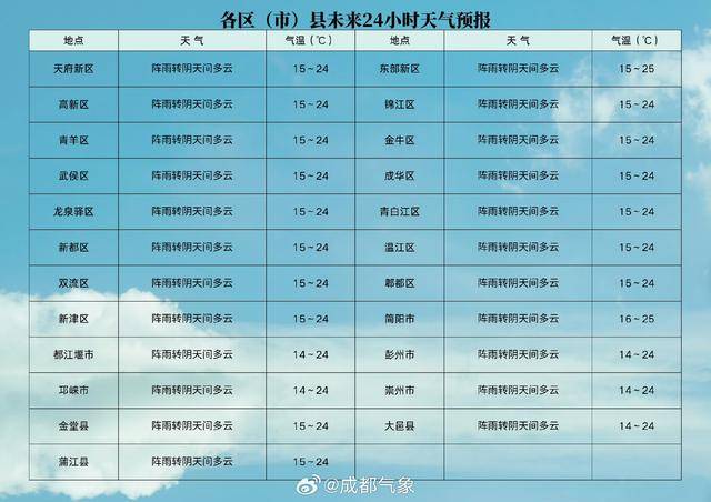 今日我市总体以云层为主,空气湿度较大早晚清凉,提醒大家适时添衣,做好保暖。预计随后两天我市降水逐步停歇,天空以阴天间多云为主,早晚多阵雨,出行可随身携带雨具;16 日白天天气转好,阳光将重返蓉城,日最高气温升至28℃,暖意浓浓。