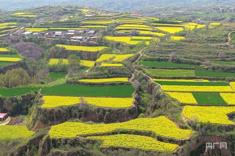 孟州市槐树乡沟壑梯田间,金黄的菜籽花与碧绿麦田交织成海,勾勒出岭区春日田园的致富图景。(央广网发 白水平 摄)