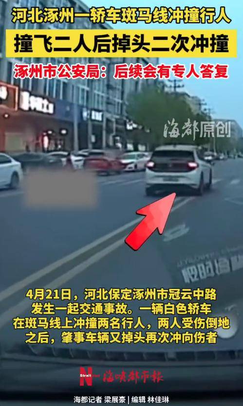 4月21日,河北保定涿州市冠云中路发生一起交通事故。一辆白色轿车在斑马线上冲撞两名行人,致两人受伤倒地。之后,肇事车辆又掉头再次冲向伤者。