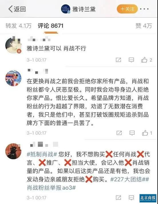 雅诗兰黛官方微博下的转评已经沦陷,多为“抵制代言人肖战”。