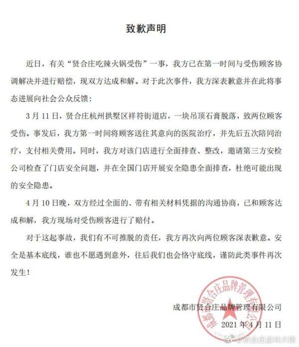4月11日晚,贤合庄火锅通过其官方微博发布致歉声明称,已与受伤顾客协调解决并进行赔偿,现双方达成和解,贤合庄火锅方面深表歉意。