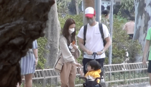 爸爸推着小车,妈妈陈凯琳走在身边,给Rafa递零食。小家伙穿得十分鲜亮,一头秀发浓密,长相秀气得像极了小女孩儿。