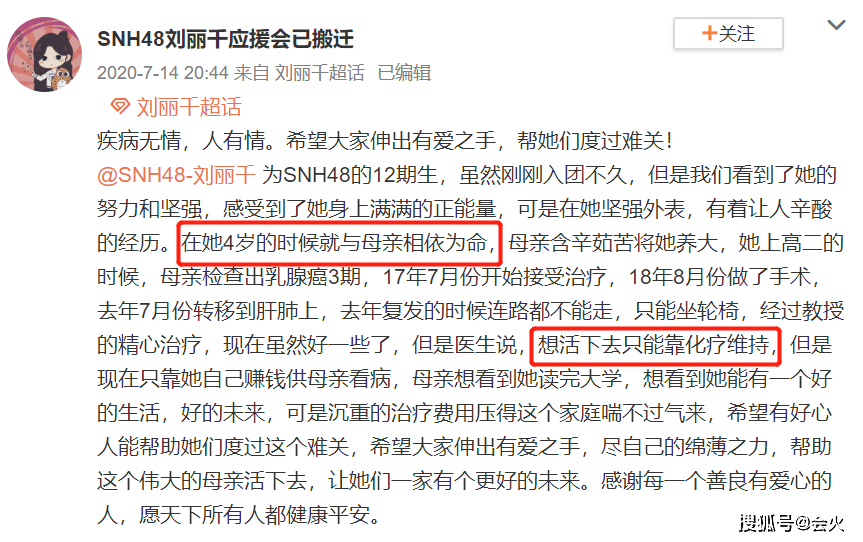 去年7月,刘丽千的母亲曾开启轻松筹为自己的癌症筹集治疗款项。当时团内许多成员都对该消息进行了转发和支持。