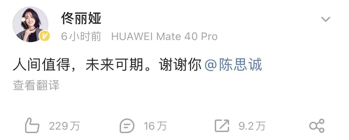 早上8点08分,演员佟丽娅在微博发文官宣与陈思诚离婚,称“人间值得,未来可期。谢谢你。”并@了陈思诚。同一时间,陈思诚也发文表示:“2011-2020故事告一段落……你们永远是我最爱的人,换种身份守护。”并放出了佟丽娅与儿子的合照。