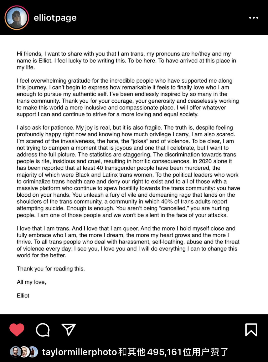 去年年底,他正式宣布为跨性别者,还顺便改了自己的名字:Elliot Page(艾略特·佩吉)。