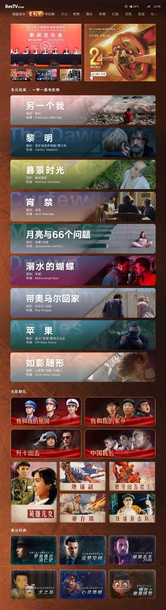 今年,庆祝建党百年的主题不仅将成为上海国际电影节金爵盛典和金爵奖颁奖典礼的亮点,还贯穿在国际电影展映、电视市场和电影市场等活动项目中。百视通在搭建线上影展专区时,围绕“致敬建党百年”,特别设置了辉煌百年、多元视角、光影永恒、大师精粹、商业巨制5个展播单元,将展出《袁隆平》、《焦裕禄》、《我和我的祖国》、《罗曼蒂克消亡史》、《另一个我》、《黎明》、《刺杀小说家》等不同年代、主题、风格的电影,展现我国新时代影视创作生产百花齐放、雅俗共赏的格局……